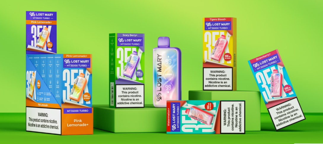 The device features ultrasonic vaping technology paired with dual mesh coils to produce smoother, consistent vapor and enhanced flavor. A unique spin-to-enhance dial lets users toggle between balanced flavor and bold tart intensity without buttons. Real-time LED indicators display battery and e-liquid levels, while draw-activated firing makes operation simple and intuitive. The Lost Mary 35K comes prefilled with a large 20 mL e-liquid capacity at 5% salt nicotine and is available in multiple flavors.